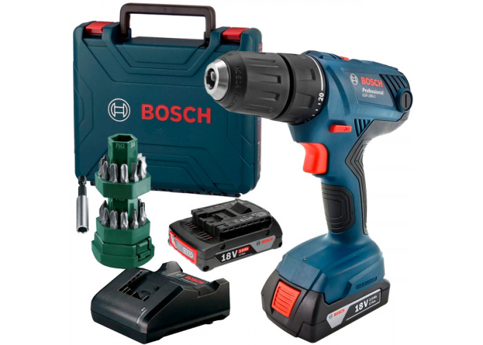 2 акб GBA 18V 2.0Ah (1600A001CG); Зарядное устройство GAL 18V-20 (2607226281); Чемодан; Набор бит Bosch, 24 шт + магнитный держатель