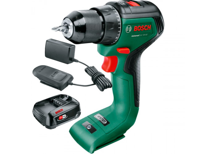 - Живиться Bosch UniversalDrill 18V-60 від акумулятора 18 В (в комплекті 1 шт).
