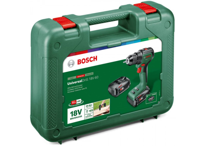 Акумуляторний інструмент Bosch UniversalDrill 18V-60 поєднує у собі функції дриля та шурупокрута. Живиться від літій-іонної батареї на 18 В (у комплекті є 2 батареї, ємність яких по 2 Ач). Оснащений апарат безщітковим двигуном, швидкозатискним патроном, діаметр якого 13 мм. Налаштовується крутний момент в 1 позицію із 20, максимальне значення становить 60 Нм. Двошвидкісний редуктор розвиває 0-500 об/хв та 0-1900 об/хв. Важить дриль-шурупокрут 1.3 кг. Доставляється він у кейсі з 2 акумуляторами, зарядним пристроєм до них.