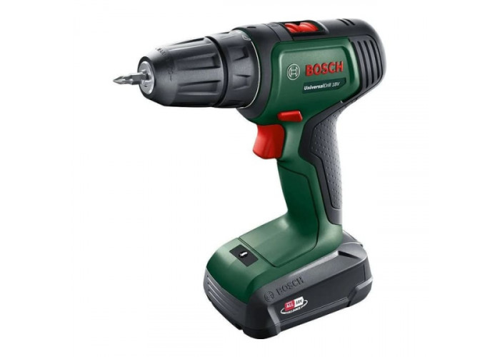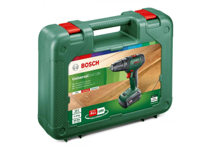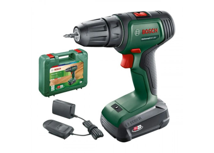 Двошвидкісний (0-440 / 1450 об/хв), компактний дриль-шурупокрут Bosch UniversalDrill 18V працює від Li-Ion акумулятора 18 В. Швидкозатискний патрон тримає насадки з хвостовиком до 10 мм. Свердлить отвори в сталі діаметром до 10 мм, у деревині — 30 мм. З максимальним обертовим моментом 40 Нм закручує-відкручує шурупи до 8 мм. Поставляється в чемодані з одним акумулятором PBA 18V 1.5Ah W-A, зарядним пристроєм AL 1810 CV, подвійною насадкою для закручування.