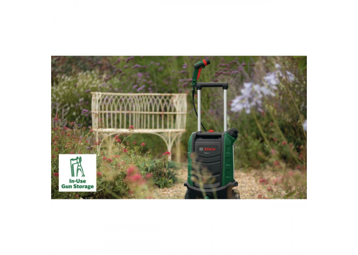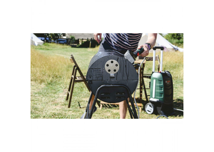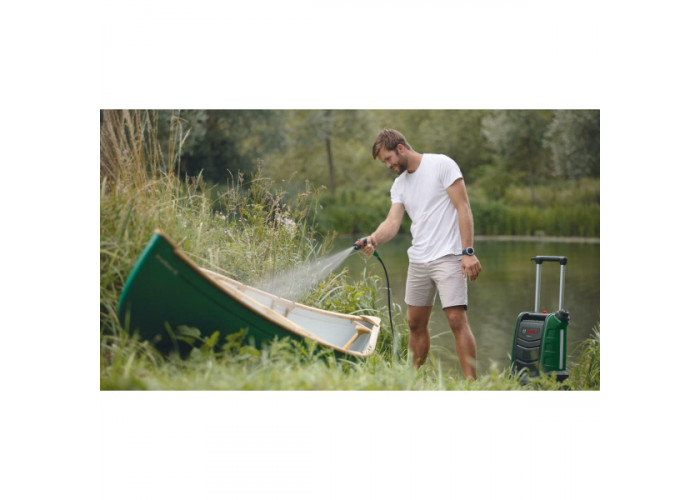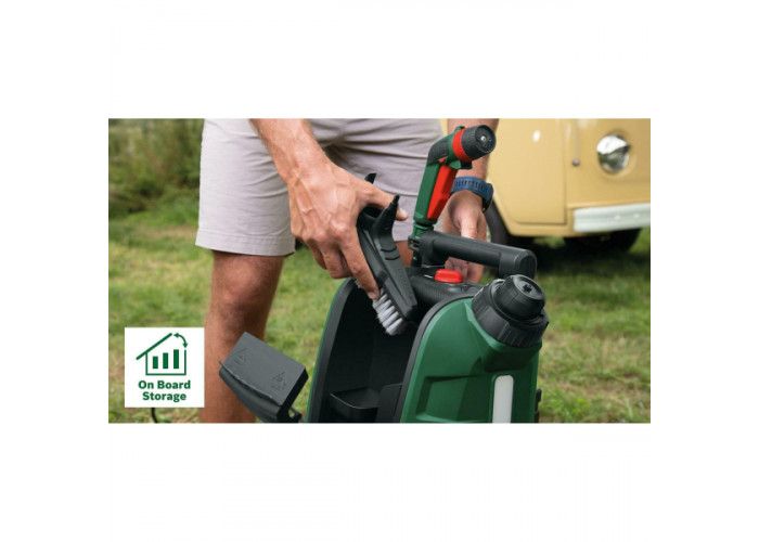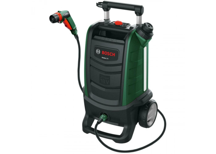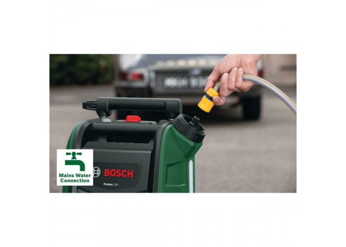 Bosch Fontus 18V – мінімийка з акумуляторним живленням для очищення різних поверхонь і автотранспорту. Живиться від літій-іонної батареї 18 В (у комплекті не постачається). Модель оснащена зручною телескопічною рукояткою, довгим гнучким шлангом 4 м і великим баком для води 15 л. Апарат має три режими роботи і створює тиск до 20 бар.