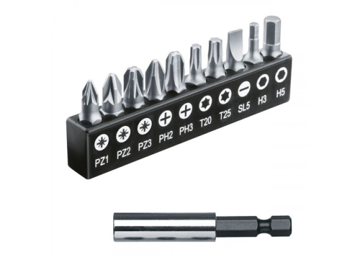 Акумуляторний шурупокрут | Кабель MicroUSB (зарядний блок не входить до набору) | Переносний кейс | Набір біт (PZ1, PZ2 PZ3, PH2, PH3, T20, T25, SL5, H3, H5) | Магнітний тримач насадок