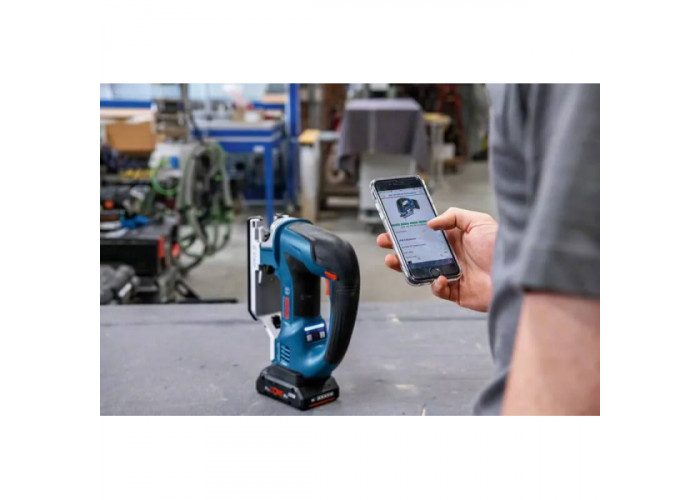- Дистанційно, через інтерфейс користувача (у додатку Bosch Toolbox), можна ввімкнути чи вимкнути LED-освітлення, обрати частоту ходів. Через Bluetooth на відстані до 30 м є можливість отримувати сповіщення, слідкувати за станом електроінструмента.