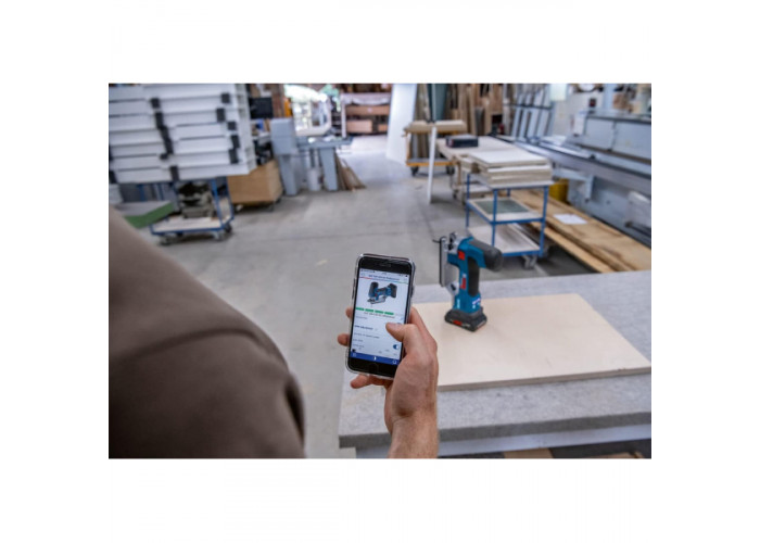 - Дистанційно, через інтерфейс користувача (у додатку Bosch Toolbox), можна ввімкнути чи вимкнути LED-освітлення, обрати частоту ходів. Через Bluetooth на відстані до 30 м є можливість отримувати сповіщення, слідкувати за станом електроінструмента.