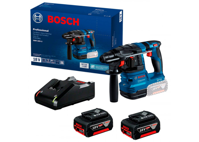 Перфоратор Bosch Professional GBH 185-LI працює від 18-вольтового літій-іонного акумулятора. Виконує кілька функцій, включно зі свердлінням з ударом і без удару, довбанням, а також вкручуванням і викручуванням шурупів. Частота ударів від 0 до 4675 уд/хв. Енергія удару 1.9 Дж. Швидкість обертів від 0 до 1050 об/хв. Патрон SDS-Plus. Безщітковий двигун. Функції KickBack і Vibration Control. Здатний створювати отвори такого діаметра: 22 мм у бетоні, 20 мм у деревині та 13 мм у металі. Вага без батареї — 2.3 кг. Поставляється з акумуляторами GBA 18V 4.0 Ah (2 шт), зарядним пристроєм GAL 18V-40.