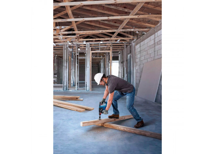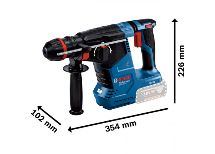 Перфоратор Bosch Professional GBH 187-LI працює на Li-Ion 18 В акумуляторі. Свердлить з ударом, без удару, виконує довбання і відгвинчує/закручує шурупи. Ударний механізм видає 4350 уд/хв, енергія удару 2.4 Дж. Швидкість обертів від 0 до 980 об/хв. Оснащений патроном SDS-Plus. Безщітковий двигун. З функціями KickBack та Vibration Control. Виробляє отвори в бетоні, цеглі, камені діаметром 4-24 мм, свердлить в деревині 30 мм, металі - 13 мм. Вага без батареї — 2.9 кг. Доставляється в чемодані з одним акумулятором GBA 18V 5.0Ah та зарядним пристроєм, з обмежувачем глибини, додатковою рукояткою.