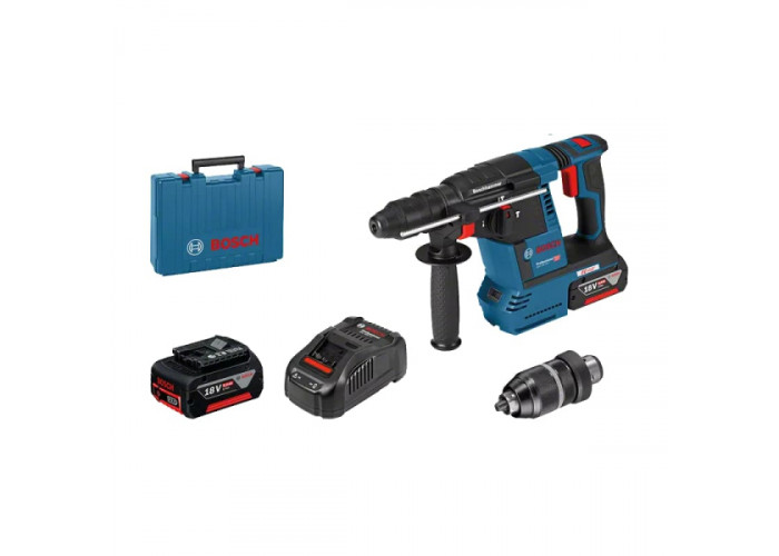 - Бездротовий перфоратор Bosch GBH 18V-26 F, що працює на LI-Ion 18 В акумуляторі, доставляється в пластиковій валізці з двома Li-Ion 18 В, 6,0 А*год, зарядним пристроєм GAL 1880 CV, обмежувачем глибини (210 мм) і додатковою ручкою.