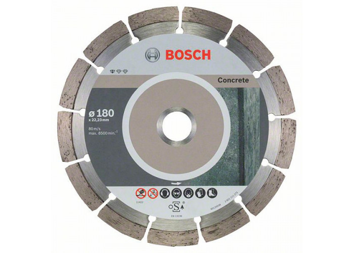 Відрізний алмазний диск Bosch Standard for Concrete діаметром 180 мм з посадкою 22,23 мм для різання бетону, пористого бетону, волоконно-цементних плит. Круг з 13 алмазними сегментами висотою 10 мм робить різ у матеріалі шириною 2 мм. В упаковці 10 шт.