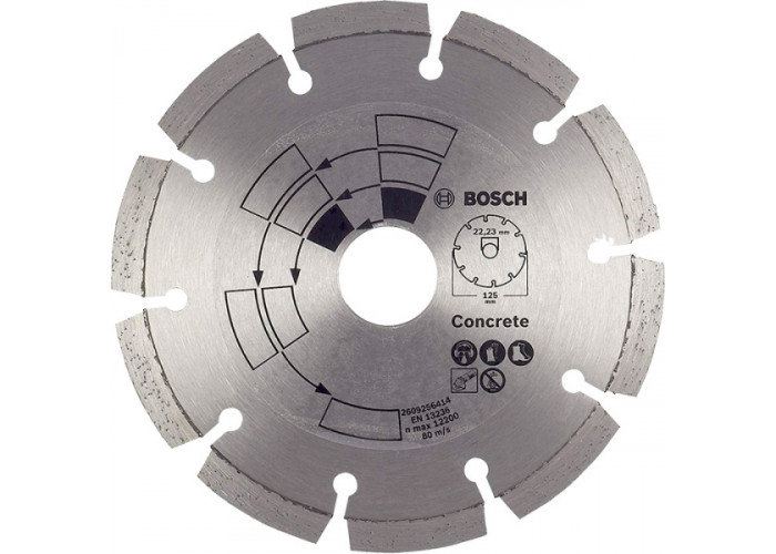 - Алмазний відрізний круг Bosch Eco Concrete діаметром 230 мм з посадкою 22,23 мм, з 17 сегментами висотою по 7 мм здійснює різ шириною 2,4 мм у бетоні.