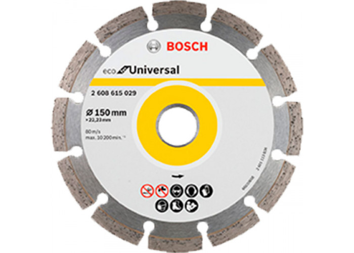 10 універсальних відрізних дисків Bosch ECO Universal діаметром 150 мм, з посадкою 22,23 мм, з 12 алмазними сегментами розріжуть тверді будматеріали.