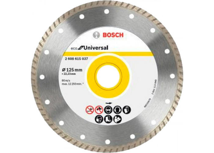 - Диск Bosch ECO Universal Turbo діаметром 125 мм, з посадкою 22,23 мм гарантує високу продуктивність різання найтвердіших будматеріалів. Чисто, без утворення відколів, розріже будь-який бетон, цеглу та камінь.