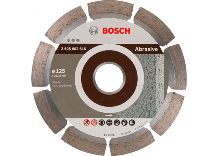 Алмазний круг Bosch Standard for Abrasive діаметром 125 мм з посадковим отвором 22,23 мм виконує різ шириною 1,6 мм і оптимально підходить для різання м'яких і абразивних матеріалів. Сегменти висотою 10 мм.