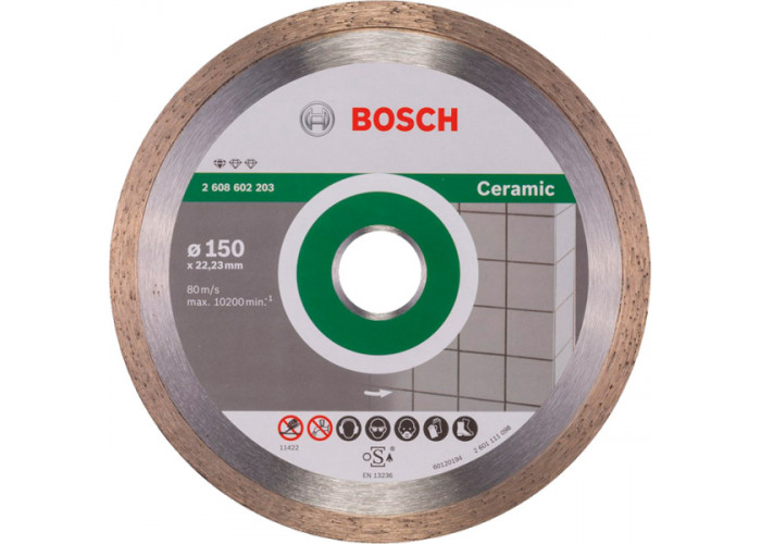 Алмазний відрізний диск Bosch Professional for Ceramic діаметром 150 мм, з посадковим отвором 22,23 мм, висотою сегментів 7 мм і шириною розпилу 1,6 мм. Економний універсальний варіант для різання плитки.