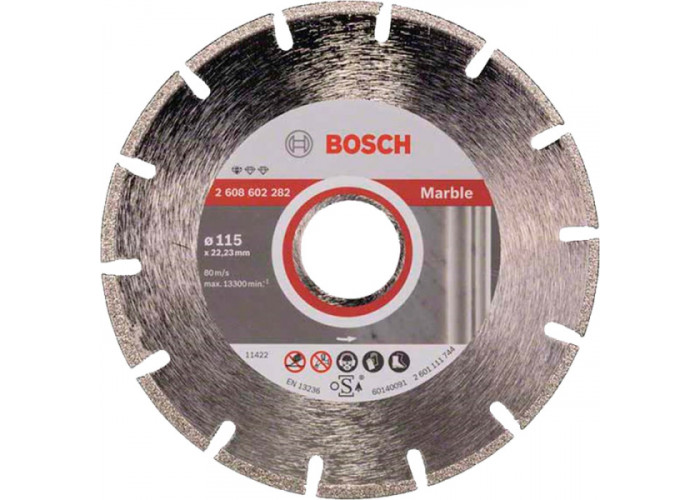 Алмазний відрізний круг по мармуру Standard for Marble від Bosch. Алмазний диск 115 мм з посадкою 22,23 мм призначений для сухого різання мармуру, органічного скла. Висота сегментів 3 мм. Ширина розпилу 2,2 мм.