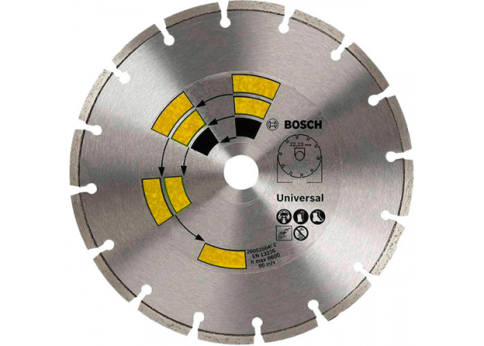 Алмазний круг Bosch Eco Universal діаметром 125 мм з посадкою 22,23 мм, з сегментами висотою по 7 мм ріже камінь, бетон, цеглу, здійснюючи різ шириною 1,7 мм.