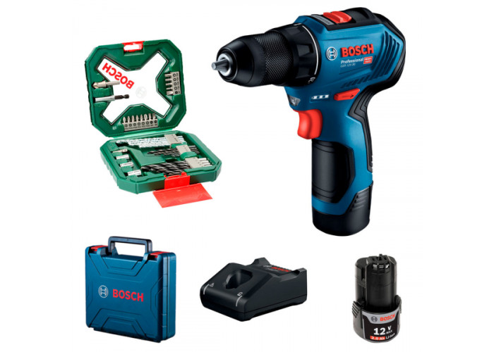 Акумуляторний дриль-шурупокрут Bosch GSR 12V-30 Professional з безщітковим двигуном. В чемодані з двома акумуляторами GBA 12V 2 Ah, зарядним пристроєм GAL 12V-40, набором 34 насадок. Дві плавно регульовані робочі швидкості (0-420 / 0-1600 об/хв). Максимальний крутний момент при жорсткому загвинчування 30 Нм, м'якому — 18 Нм. Швидкозатискний патрон. Закручує та відгвинчує кріплення до 8 мм, свердлить деревину (20 мм), метал (10 мм).