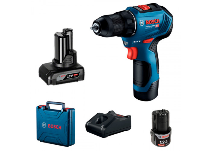 Акумуляторний дриль-шурупокрут Bosch GSR 12V-30 Professional з безщітковим двигуном. В чемодані з двома акумуляторами GBA 12V 2 Ah та одним GBA 12V 6 Ah, зарядним пристроєм GAL 12V-40. Дві плавно регульовані робочі швидкості (0-420 / 0-1600 об/хв). Максимальний крутний момент при жорсткому загвинчування 30 Нм, м'якому — 18 Нм. Швидкозатискний патрон. Закручує та відгвинчує кріплення до 8 мм, свердлить деревину (20 мм), метал (10 мм).
