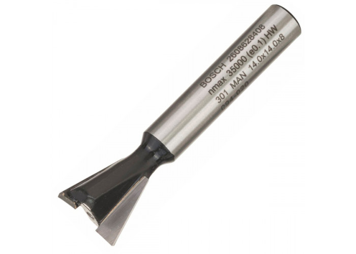 Фреза «ластівчин хвіст» з хвостовиком 8 мм, діаметром 14 мм, робочою довжиною 15 мм і загальною — 55 мм для вирізання шипових з'єднань. Твердосплавна, з двома ріжучими кромками підходить для роботи з будь-якою деревиною.