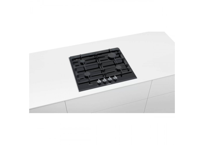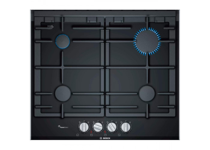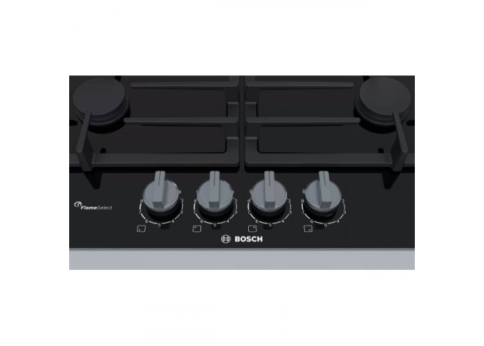 Варильна поверхня Bosch PRP6A6D70R з 4 газовими конфорками різної потужності. Автоматичне електричне разпалення полум'я простим поворотом ручки. Захист від витоку газу. Регулювання полум'я FlameSelect.