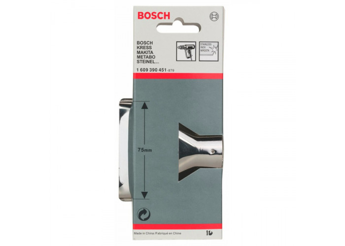 Плоское сопло Bosch предназначен для того, чтобы равномерно распространять горячий воздух на поверхность. Размеры: диаметр 33,5 мм, ширина 75 мм. Применяют для снятия краски, сушки, подогрева, разморозки трубы. Подойдет для профессиональных и бытовых строительных фенов.