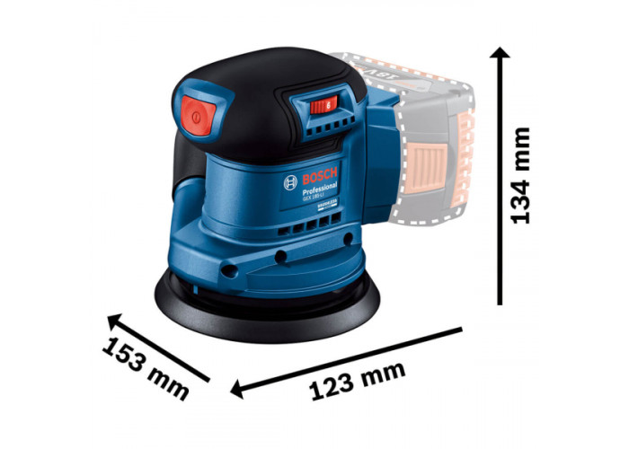 - Мініатюрна конструкція розмірами 123х153х134 мм і вагою 1.3-2.3 кг (залежить від ємності та типу встановленого акумулятора) продумана для зручного утримання орбітальної шліфмашинки однією рукою.