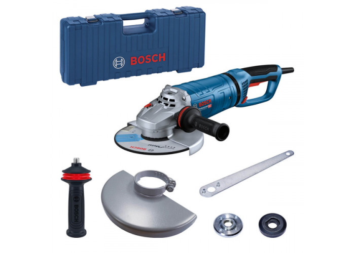 Большая угловая шлифмашина 2700 Вт с плавным пуском, поворотной рукояткой и защитой от обратного удара под круги 230 мм диаметра. Чемодан в комплекте