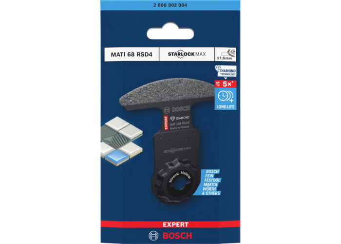 - Bosch Expert MATI 68 RSD4 размером 68x10 мм и шириной реза 1,6 мм представляет собой сегментированное полотно с алмазным покрытием, разработанное специально для сверхбыстрого фрезерования раствора для затирки швов и абразивных материалов.