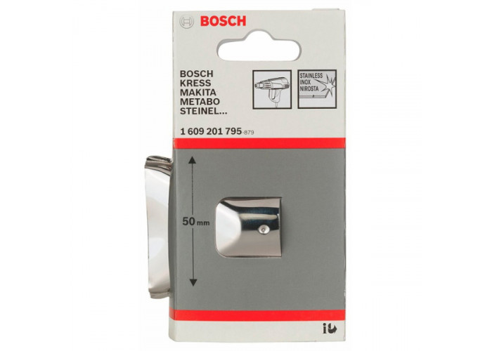 Плоское сопло Bosch предназначен для того, чтобы равномерно распространять горячий воздух на поверхность. Размеры: диаметр 33,5 мм, ширина 50 мм. Применяют для снятия краски, сушки, подогрева, разморозки трубы. Подойдет для профессиональных и бытовых строительных фенов.
