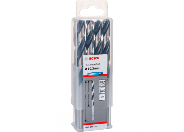 - 5 спиральных сверл Bosch HSS-PointTeQ диаметром 10,2 мм, общей длиной 133 мм, рабочей — 87 мм для изготовления отверстий в листовом металле, алюминии, конструкционной стали. Подходят для сверления пластмасс, древесины, сэндвич-панелей.