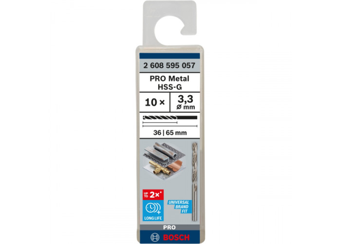 Праворежущие спиральные сверла Bosch HSS-G, DIN 338 диаметром 3,3 мм, рабочей длиной 36 мм, полной — 65 мм из быстрорежущей стали. Угол стружечной канавки относится к типу N. Острие при вершине 135 градусов с крестообразной подточкой. Размер хвостовика равен диаметру сверления. В упаковке 10 шт.