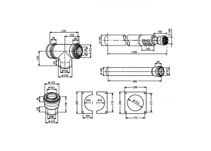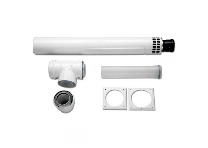 - Коаксіальний горизонтальний комплект Bosch AZB 632/2: адаптер підключення котла DN80/125 - 100/150, відведення 90° з ревізійним отвором, подовжувач довжиною 1135 мм, діаметром 100/150 мм.