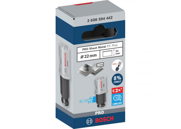 Коронка Bosch PRO Sheet Metal PC Plus призначена для виконання отворів у листовій сталі та листах нержавіючої сталі. Оснащена зубцями зі швидкорізальної сталі HSS з 8% додаванням кобальту. Діаметр коронки 22 мм, її робоча висота 20 мм. Хвостовик швидкозмінний Power Change Plus.