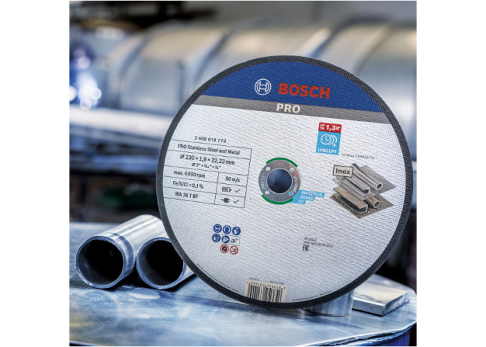 - Прямий круг Bosch Expert for Inox діаметром 230 мм, з посадкою 22,23 мм, товщиною 1,9 мм швидко та чисто ріже нержавіючу сталь.