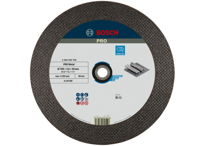 - Прямий відрізний круг для різання металу Bosch PRO Metal діаметром 305 мм з посадковим отвором 20 мм, товщиною 3.6 мм.