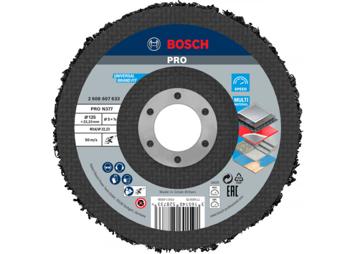- Зачисний круг Bosch Best for Metal 125 мм у діаметрі, з посадкою 22,23 мм для ефективної обробки чорних, кольорових металів, сталі.