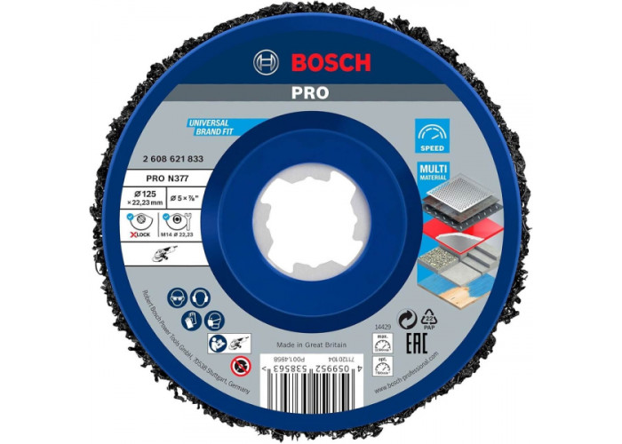 • Зачисний круг Bosch PRO N377 X-Lock Multi Material Cleaning Disc діаметром 125 мм — це високоефективний інструмент для очищення різних поверхонь від іржі, фарби та нальоту.