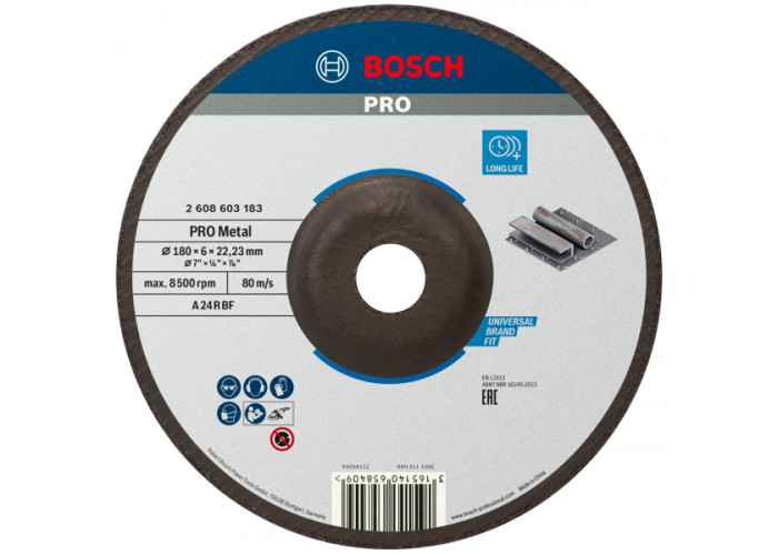 Опуклий обдирний круг Bosch Standard for Metal діаметром 180 мм, товщиною 6 мм, з посадкою 22,23 мм — робоча насадка до кутових шліфмашин Bosch 180 мм, за допомогою якої можна якісно обдерти, зачистити, відшліфувати металеві профілі, труби, заготовки.