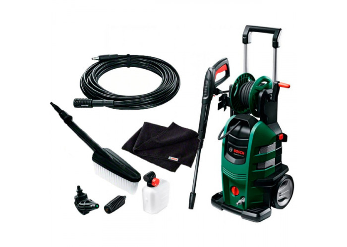 Мийка високого тиску Bosch AdvancedAquatak 160 потужністю 2600 Вт, з 4-циліндровим самовсмоктувальним насосом. Допустима температура води +40 градусів. Витрата води 570 л/год. Тиск 160 бар. Autostop. Фільтр для очистки води на вході. Телескопічна ручка, барабан для намотування шланга, місця на корпусі для зберігання приладдя. Набір для мийки авто.