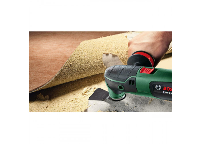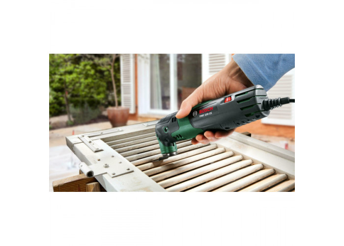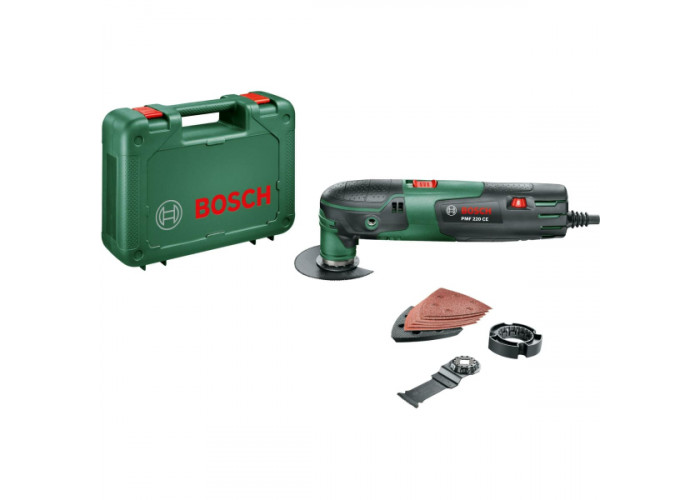 Зручний у використанні, легкий (1,1 кг) універсал Bosch PMF 220 CE потужністю 220 Вт, що виконує розпил, фрезерування, зачистку, шліфування, полірування різних матеріалів. Магнітний тримач насадок Starlock для швидкої зміни робочого інструменту. 6-ступінчаста регулювання кількості обертів від 15000 до 20000 об/хв. Константна електроніка. Установка частоти коливань (кут коливань вліво-вправо 2,8°). 4-рівневий обмежувач глибини. Мультитул поставляється в пластмасовій валізі з набором дельташліфувальних аркушів, біметалічним полотном 85 мм по дереву та металу ACZ 85 EB, дельташліфпластиною 93 мм АВЗ 93 G, HCS пиляльним полотном для деревини 32х40 мм AIZ 32 EPC, шестигранним ключем і 4-ступінчастим обмежувачем глибини.