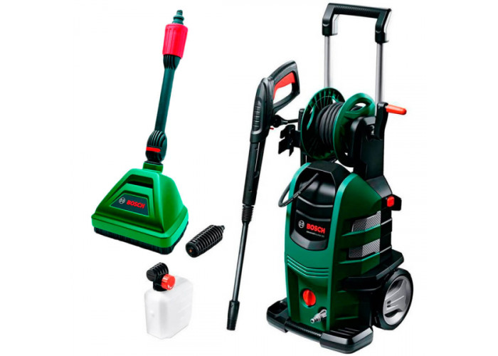 Мийка високого тиску Bosch AdvancedAquatak 150 потужністю 2200 Вт, з 4-циліндровим самовсмоктувальним насосом. Допустима температура води +40 градусів. Витрата води 480 л/год. Тиск 150 бар. Autostop. Фільтр для очистки води на вході. Телескопічна ручка, барабан для намотування шланга, місця на корпусі для зберігання приладдя, миючою щіткою Compact Brush.