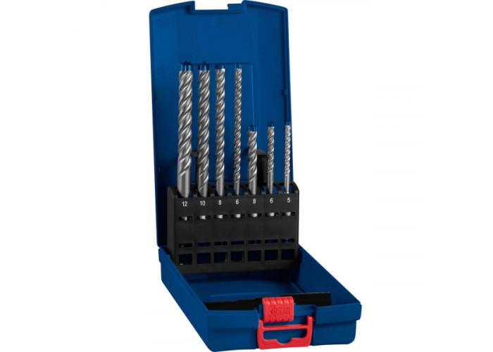 Комплект складається із 7 бурів Bosch Expert SDS-Plus-7X різних діаметрів — 5, 6 і 8 мм (загальною довжиною 115 мм) і 6, 8, 10 і 12 мм по 165 мм. Мають Робоча довжина становить по 50 і 100 мм. Виготовлені головки з карбідного сплаву для високої продуктивності ударного свердління у камені та бетоні, зокрема в армованому.