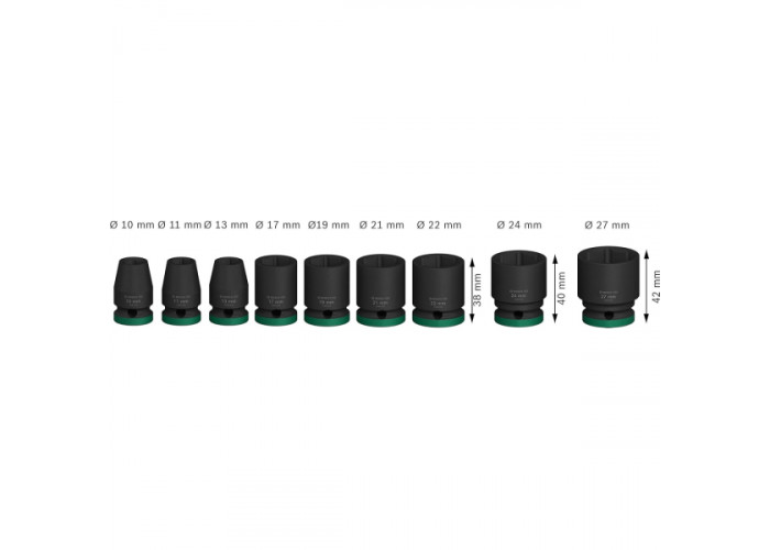 Набір ударних торцевих головок висотою 38/40/42 мм із хвостовиком 1/2 дюйма під квадратний кріплення діаметром 10, 11, 13, 17, 19, 21, 22, 24, 27 мм