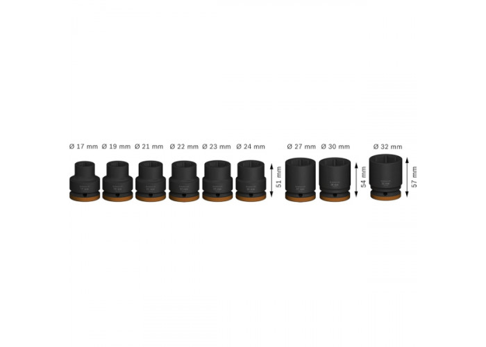 Набір ударних торцевих головок висотою 51/54/57 мм із хвостовиком 3/4 дюйма під квадратне кріплення діаметром 17, 19, 21, 22, 23, 24, 27, 30, 32 мм