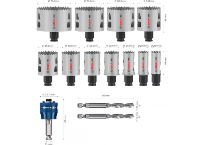 Набір коронок Bosch PRO Multi Material PC Plus спеціально створений для ефективного свердління різноманітних матеріалів (гіпсокартон, кольорові метали, металеві труби та профілі, м'яка деревина, пластик), забезпечуючи професійну точність і високу якість роботи. Комплект включає 6 ріжучих головок з адаптером Power-Change Plus і центрувальними свердлами, що робить його універсальним. Діаметр коронок становить 20, 22, 25, 32, 35, 40, 44, 51, 60, 64, 76 мм. Загальна довжина - 44 мм. Габаритні розміри упаковки 300х200х100 мм. Вага комплекту 1.5 кг.