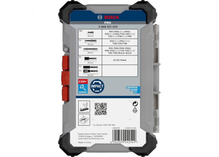 Набір Bosch PRO Impact Set призначений для професійного використання під час ударного та безударного загвинчування і складається з 36 предметів: 31 біти, 2 тримачів і 3 торцевих головок. У комплекті представлені шліци типів PH, PZ, SL і T. Усі елементи мають хвостовик розміром 1/4 дюйма під шестигранник. Поставляється в практичному футлярі системи Pick and Click.