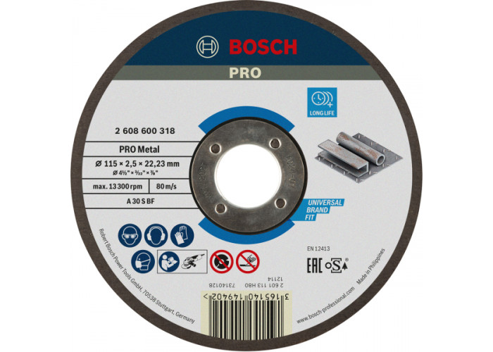- Прямий відрізний круг по металу Bosch PRO Metal діаметром 115 мм з посадковим отвором 22,23 мм, товщиною 2,5 мм.