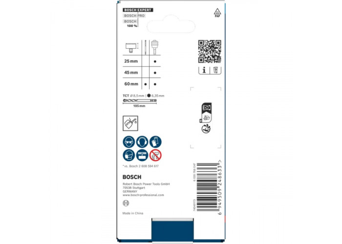 - До комплекту входить центрувальне свердло з твердосплавним наконечником TCT розміром 8.5х60х105 мм, призначене для впевненого початку свердління в твердих і абразивних матеріалах. Свердло оснащене шестигранним хвостовиком 6.35 мм, що забезпечує надійну фіксацію і хорошу передачу крутного моменту