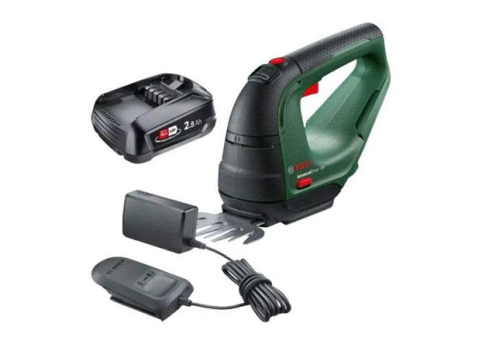 Ножиці акумуляторні Bosch Advanced Shear 18V-10 — функціональний, ручний електроінструмент, який живиться від літій-іонного акумулятора напругою 18 В і ємністю 2,5 Ah. Працює як з кущами, так і з травою. Максимальна оброблювана площа — 85 м2. Легкий та компактний (важить 1.45 кг). Доставляється у картонній коробці з 2 насадками-ножами (для трави, довжиною 20 см і кущів, шириною 10 см).
