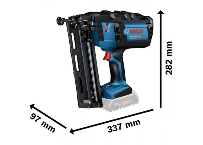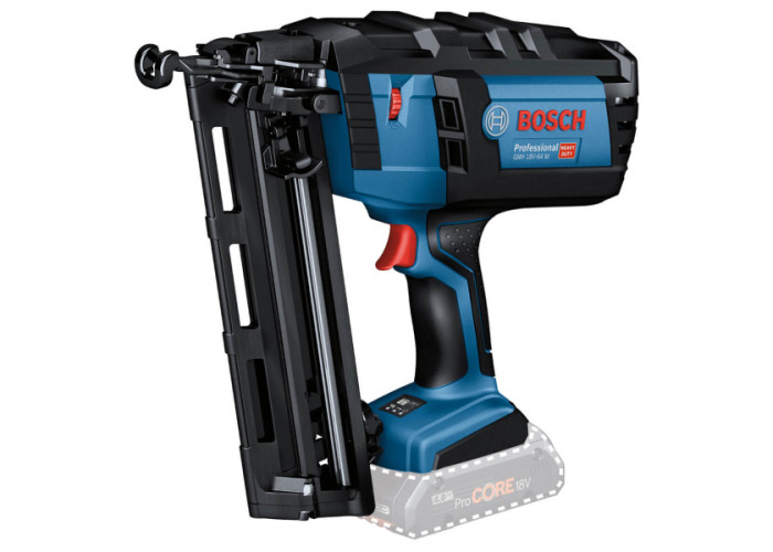 Професійний цвяхозабивач Bosch GNH 18V-64 M живиться від літій-іонної батареї 18 В (2 шт в комплекті). Продуманий для швидкого та надійного забивання цвяхів — діаметром 1.6 мм, довжиною 32-64 мм — у деревину, пластик, ДСП. Оснащений інструмент магазином на 105 гвіздків. Має 2 системи спрацювання: одноразова із блокуванням і контактна з автоповерненням. Важить 2.9 кг (соло версія) і до 4.3 кг (із батареєю).