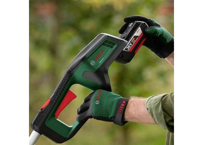 - Bosch AdvancedBrushcut 36V-23-750 має зручну конструкцію з ергономічною D-подібною рукояткою для надійного утримання.
